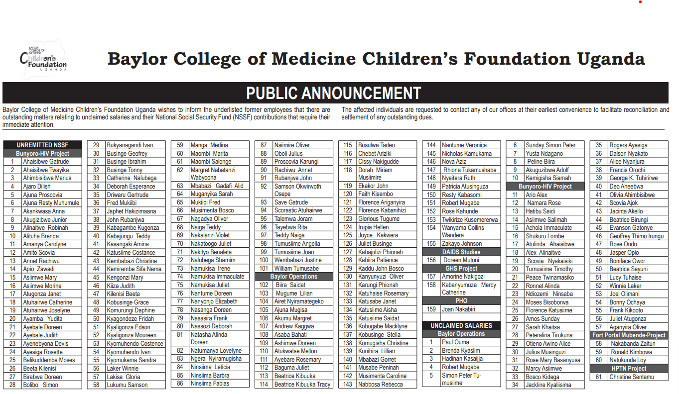Baylor College of Medicine Children’s Foundation Uganda wishes to inform the underlisted former employees that ...